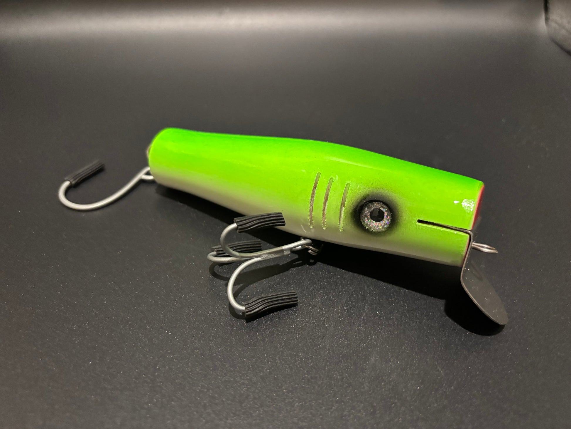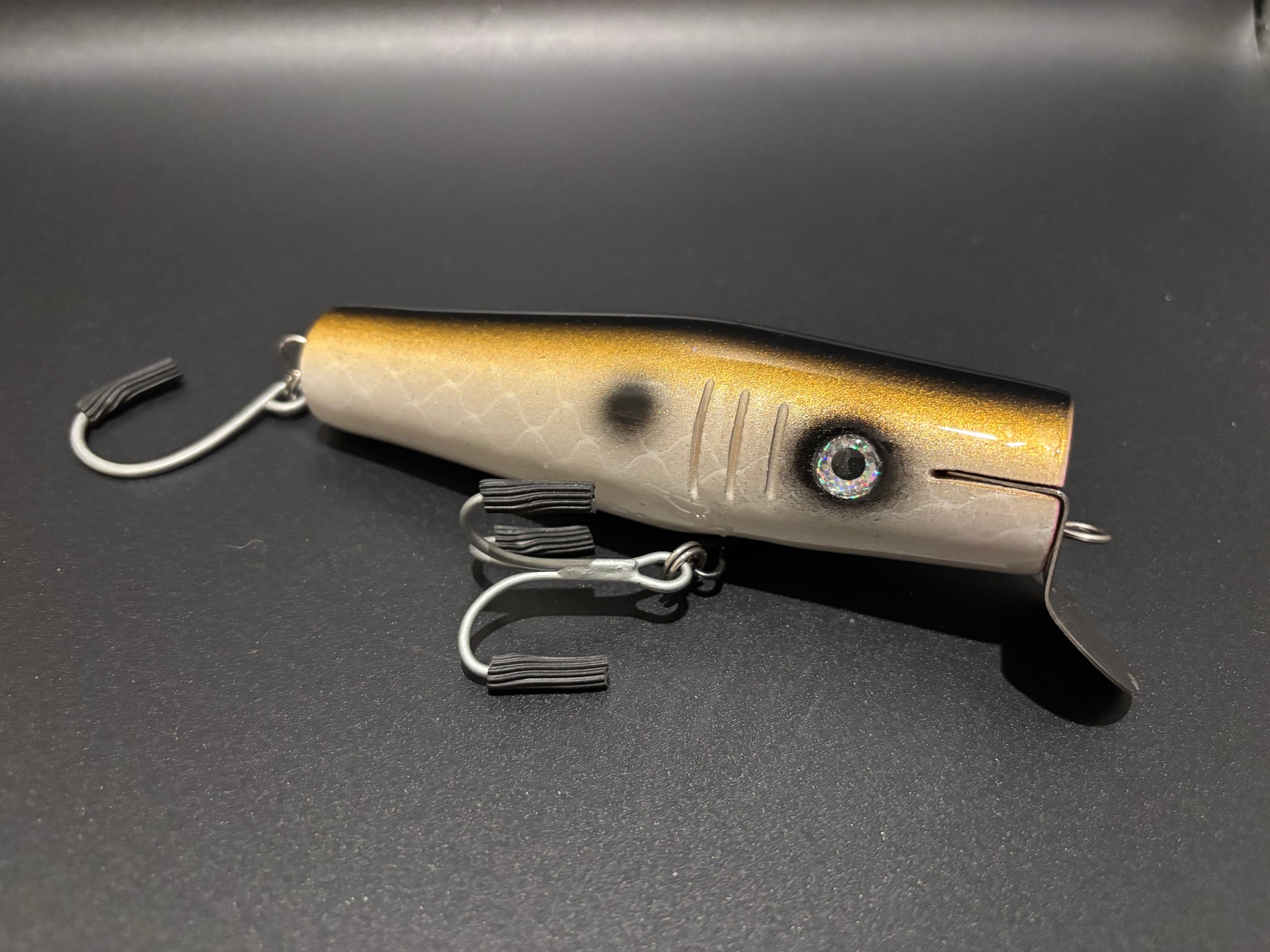 This Surface Swimmer has a very low through hole making this plug swim top water. It has a wide side-to-side action with a small role creating a large attraction on the surface.